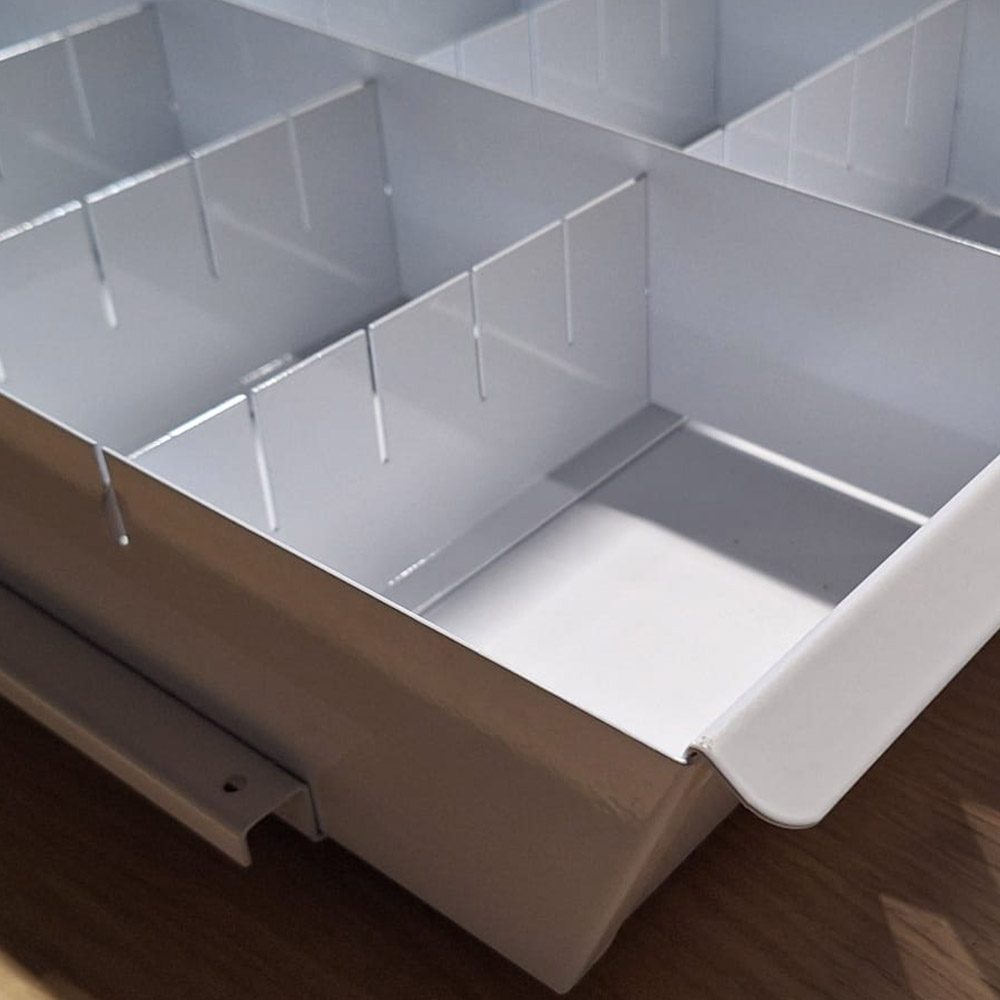 De vakverdeling bestaat uit 3 breedteschotten en 5 instelbare diepteschotten. Dit product kan alleen in combinatie worden gebruikt met de Sovella dubbele dragers van 40 of 45 cm